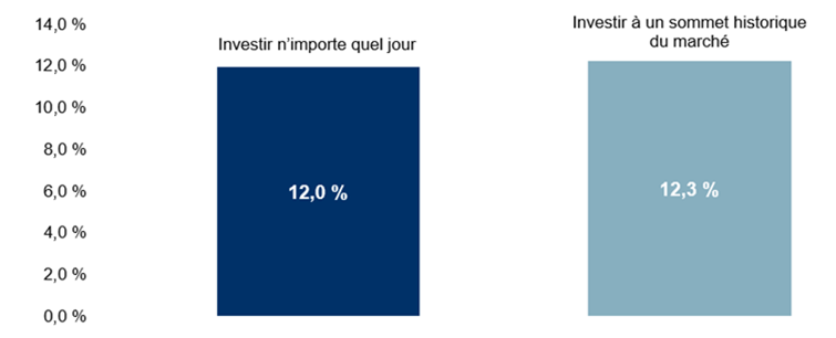 Fait surprenant, investir dans le S&P500 à des sommets historiques s’est avéré, par le passé, être une stratégie parfaitement viable. Depuis 1950, les rendements enregistrés après des sommets historiques ont été supérieurs aux rendements après un achat lors d’une journée moyenne. Cela peut sembler paradoxal, mais c’est logique : les sommets historiques tendent à se regrouper lors des périodes de robustesse des marchés. En vendant trop tôt vos placements, ou en restant sur la touche, vous risquez de passer à côté de gains importants.